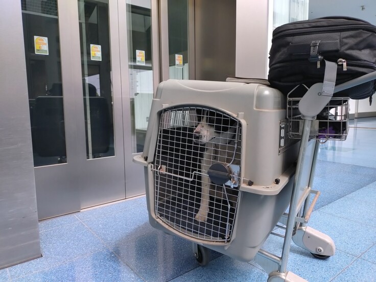 しかしながら、まだここは日本の空港。なんとか米国系の航空機でキャビン搭乗を認めていただいたレラも飛行機に乗るまではクレートです。