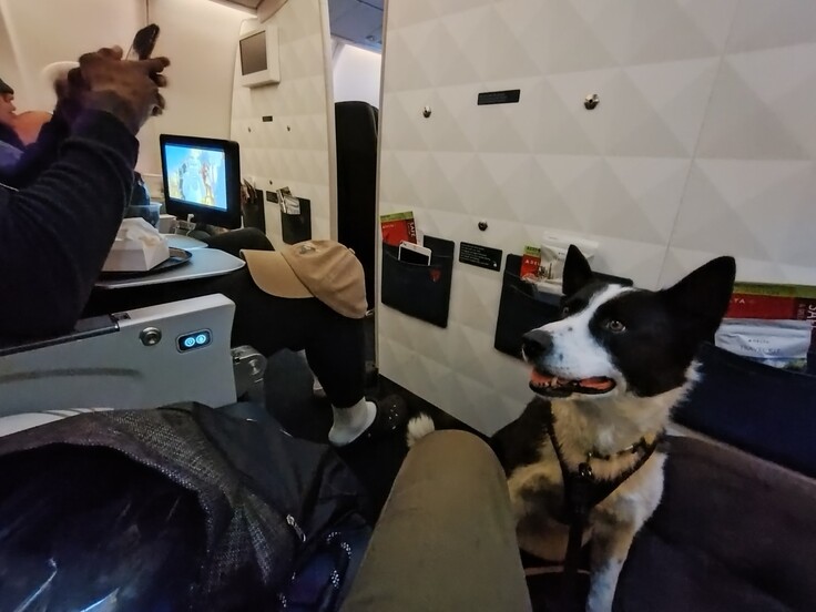 不安は的中。この日のフライトはかなり揺れ、私たちのやや後方の方が何度も嘔吐され、アテンドの方も往来を繰り返し異様な空間の中、レラも揺れと空腹、喉の乾きで、落ち着きがなく、最初の6時間はほとんど寝ず、ピーピーと鳴くこともしばしば。さらに満席に近く、私の両サイドにも体の大きな白人と黒人の男性に挟まれて身動きが取れない状態でした。
