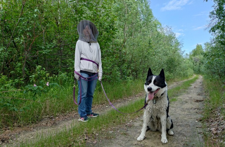 散歩中も立ち止まると蚊の大群に取り囲まれるのでネットをかぶる。