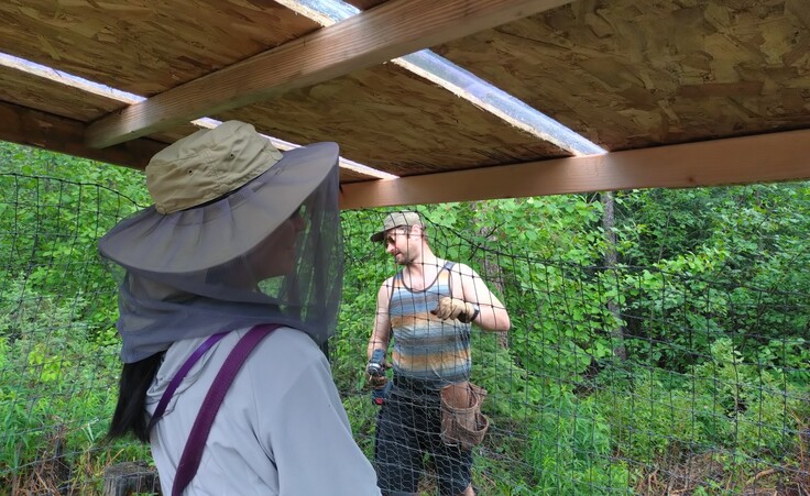 犬小屋づくり。ネイティブ・アラスカンはすごい。蚊の大群に囲まれてもこの格好。