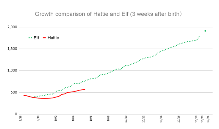 緑の点線は、前回のタマの出産時に、とても小さく(414g)死んだ状態で産まれて蘇生作業をして息を吹き返した「エルフ」の体重変化で、赤の実線がハッティーの体重変化です。