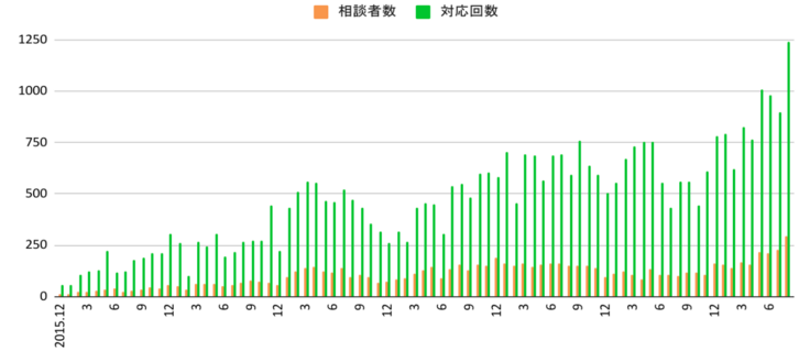 「にんしんSOS東京」月別相談者数と対応回数の推移: