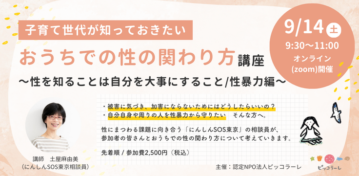 など、「性」にまつわる課題に向き合うピッコラーレの相談員が、相談の現場からリアルに感じていることを元に、参加者の皆さんと一緒におうちでの性教育を考えていきたいと思います。