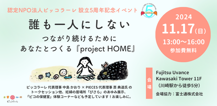 5周年記念イベント「誰も一人にしない〜 つながり続けるために あなたとつくる『project HOME』〜」では、若年妊婦のための居場所「ぴさら」や出張「ピコの保健室」など、project HOME(居場所事業)の事業で取り組んできたこれまでの活動を展示や体験コーナーなど多様な形で楽しく振り返る時間をご用意。