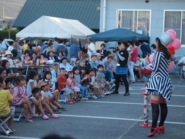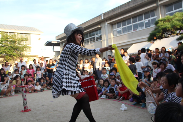 また、今年は「平成30年7月豪雨」という大変な災害が私たちの住む福山市のすぐ近くでおこりました。この災害により被害を受けた方々は住居を失い、今も避難所で生活されている方がいます。さらには、そのご家庭の子どもたちは家を失い、普段の生活を失い笑顔が消えてしまっていました。そこで、今回みなさんにいただいたご支援で被災地支援として大道芸を避難所で開催された3つのお祭りにお届けさせていただきました。