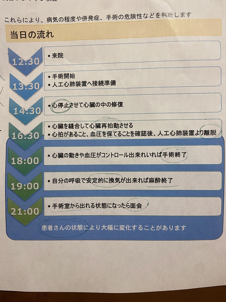 7月6日に手術予定だった時のスケジュール表なので、時間は違いますが流れはこんなかんじです。