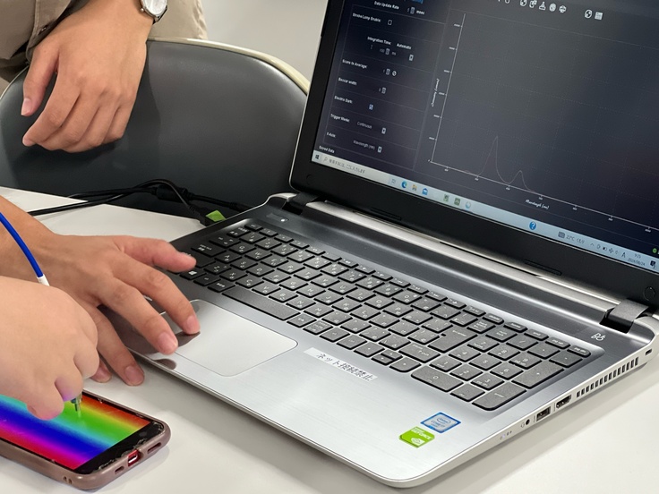 ・分光器でディスプレイからの光のスペクトルを記録する実験