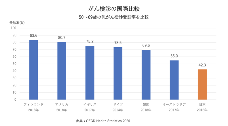 日本の乳がん検診受診率は、先進国の中で「最も低い」現状にあります。