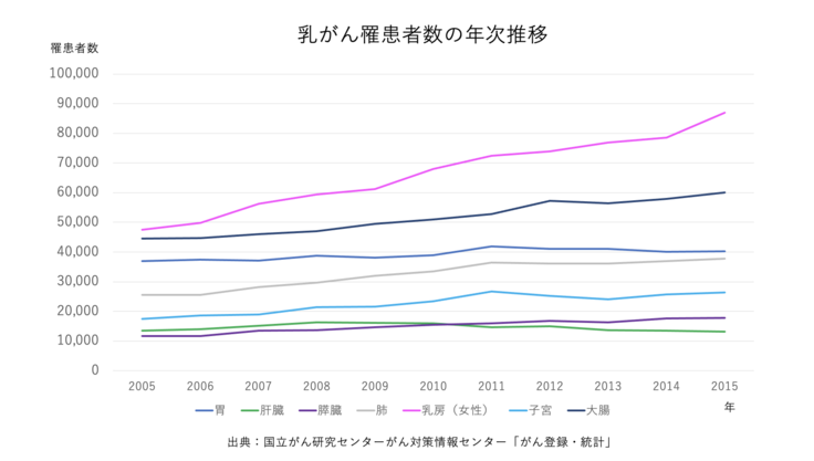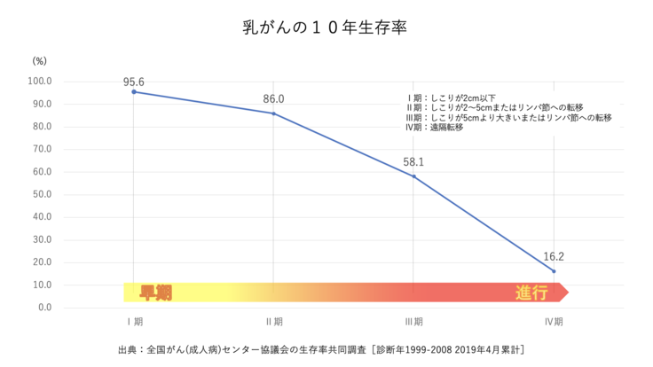 検診受診率の向上に伴い、乳がんの早期発見が増え