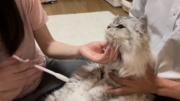 投薬中にあご下をなでなでされているぴのでした🐈