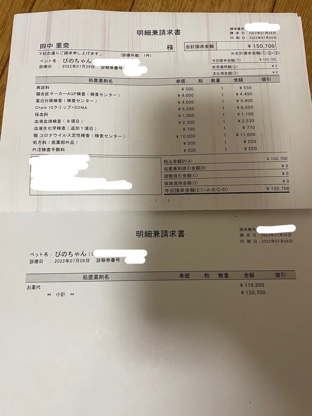 今回はお薬以外にも検査が複数あったため治療費が多くなっています。