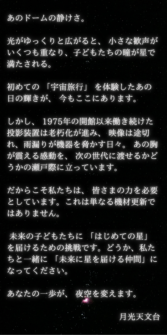 天文教育は、子どもたちの豊かな感性を育み、夢や希望を与えてくれるものだと信じています。この挑戦を通して、全国のみなさまと一緒に「未来に星を届ける仲間」になれたら、とても心強く思います。どうか、私たちと一緒にこの星空を守り、未来へつなぐ力を貸してください。