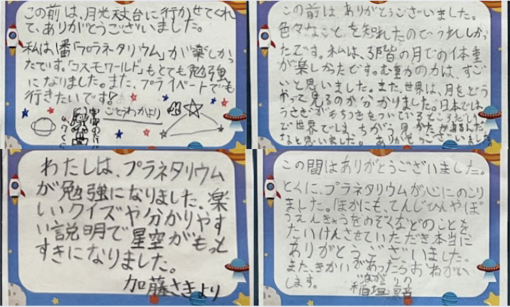初めての「宇宙旅行」での感想は人それぞれ。「宇宙のことを大好きになった」「太陽のことが勉強になった」「冬の大三角について詳しく知れてうれしかった」というさまざまな学びやきっかけになれていることが私たち職員の喜びでもあります。