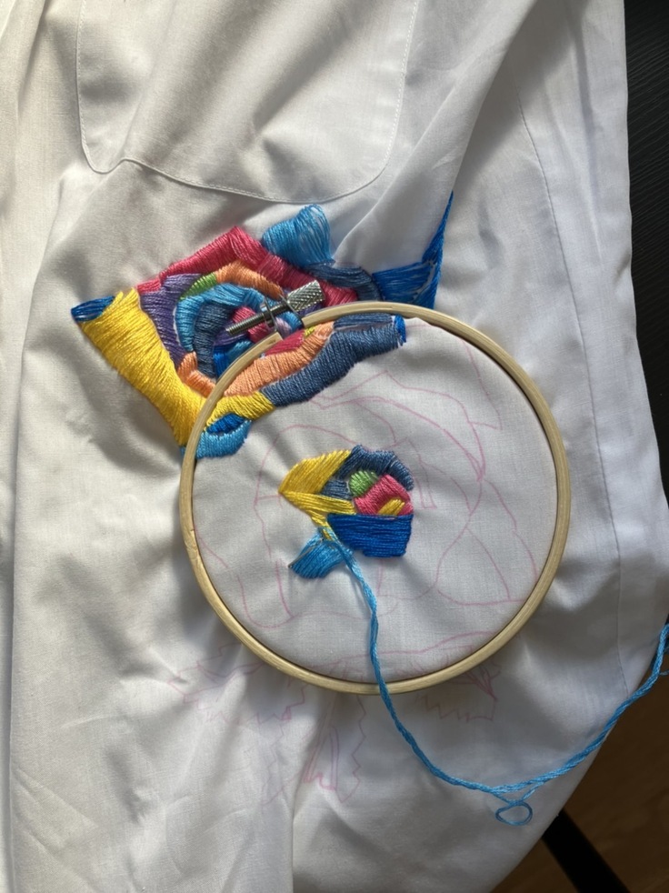白系とゴールド系の花刺繍を依頼、色の組み合わせは自由に表していただくようにお伝えしました。出来上がりは想像以上で、たくさんの色を使って花模様をグラデーションで表現してくださり、アートのような刺繍作品になりました。