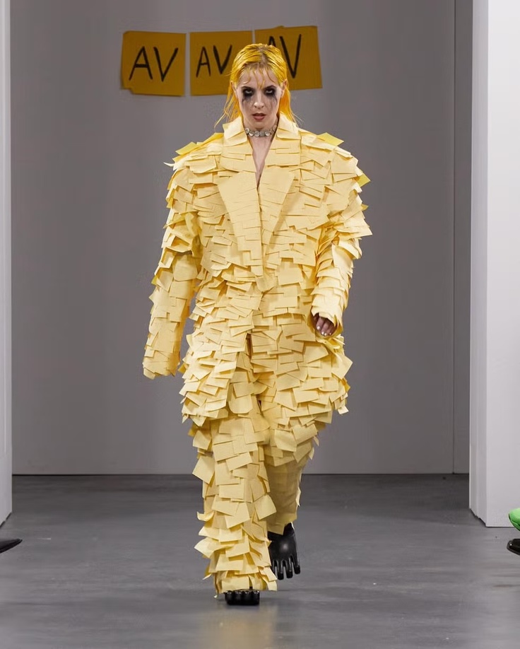 付箋(ポストイット)を全面にたくさん貼り付けられたスーツや、ガムテープを体にぐるぐる巻いたドレスなど、賛否が分かれ話題になったのを覚えていました。