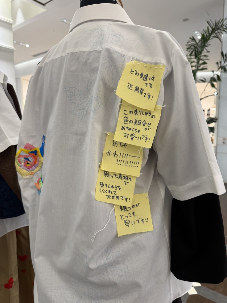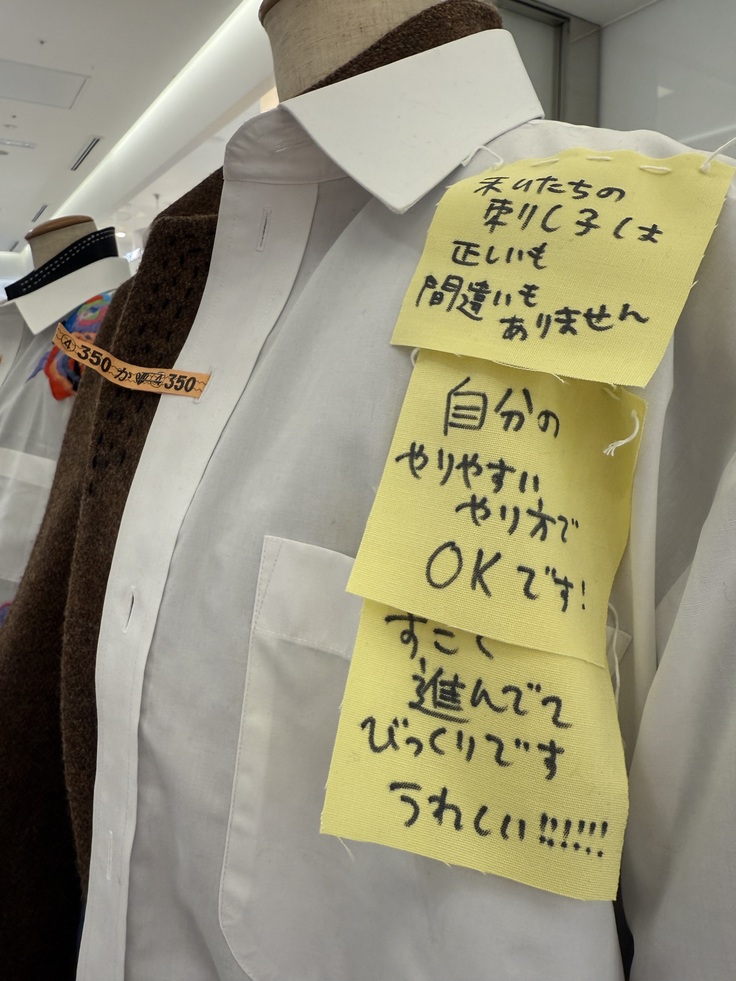 コレクションのテーマ【ストレス】が、点と線と面の刺し子と真逆であることに面白さを感じて、テーマを《コウフク》に変え、ポジティブワードしか書かれていない付箋を付けました。