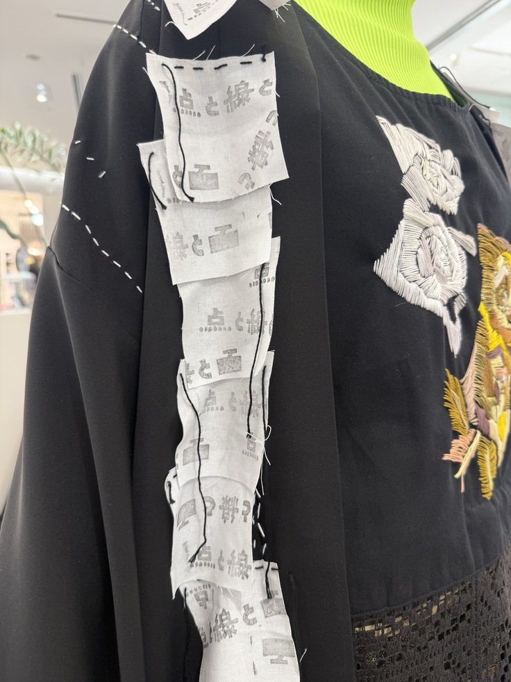 その黒いベストに、前面に刺繍がされた帯を合わせて前垂れの付いたトップスに。帯の高さに合わせるように、リターン商品を前掛けならぬ後ろ掛けにして、ロングジレのような袴のようなスタイリングにしました。