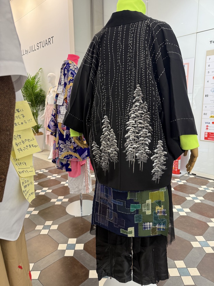 着物の羽織は元の着物の柄を活かし、木々に雪のような雨のような景色を、刺し子で表現しています。