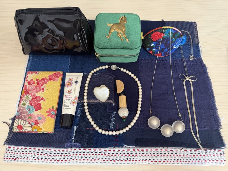 展示に使用しなかった前掛けのサンプルを、折りたたんでマイスペースにして毎朝向き合うお気に入り空間に。