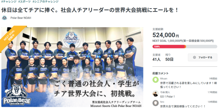 そしてネクストゴールとして、目標金額を100万円に引き上げ、いただいたご支援を世界大会の渡航費に充てさせていただきます。
