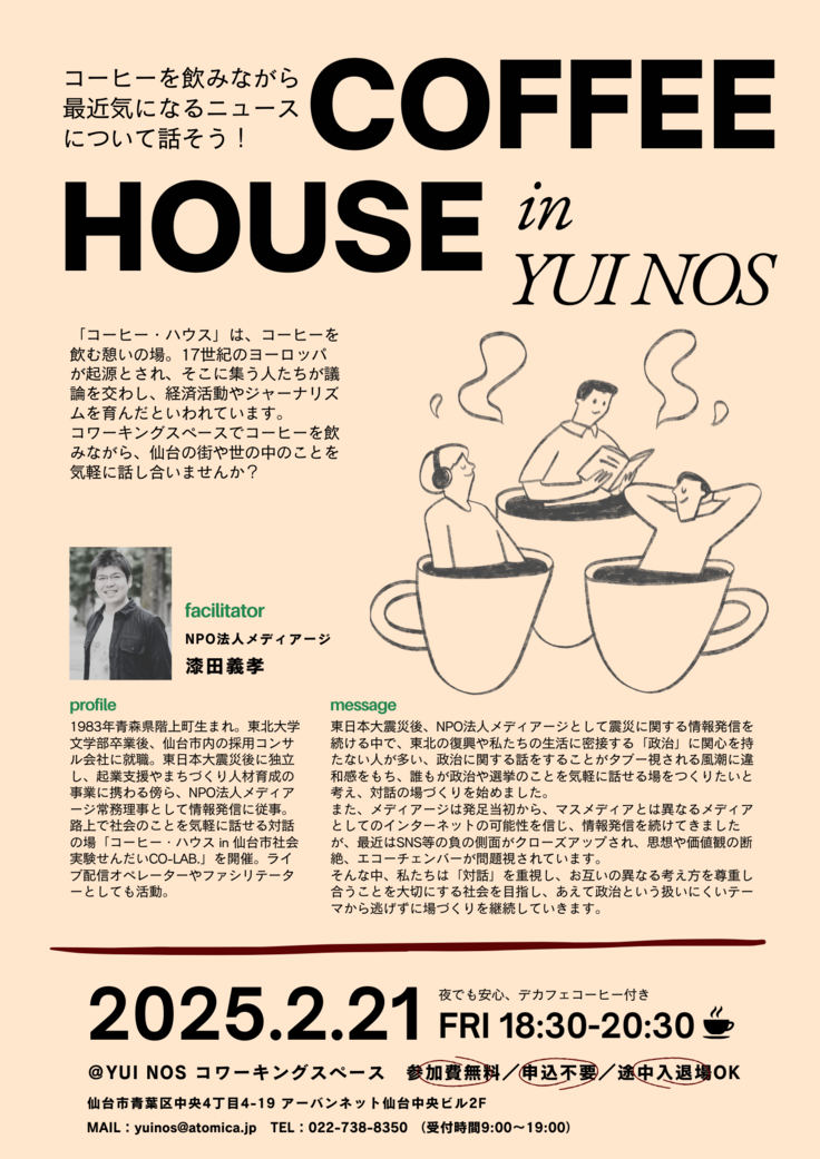 17世紀のヨーロッパが起源とされる、コーヒーを飲む憩いの場「コーヒー・ハウス」。そこに集う人たちが議論を交わし、経済活動やジャーナリズムを育んだといわれています。社会の情報基地としての取り組みは現代にも受け継がれ、世界各地でコーヒー・ハウスという名のコミュニティやイベントが存在します。YUI NOSではこのたび、仙台で「コーヒー・ハウス in 仙台市社会実験せんだいCO-LAB.」を手がけるNPO法人メディアージの漆田義孝さんと一緒に、コーヒー・ハウスをはじめます。コワーキングスペースでコーヒーを飲みながら、仙台の街や世の中のことをみんなで気軽に話し合いませんか?