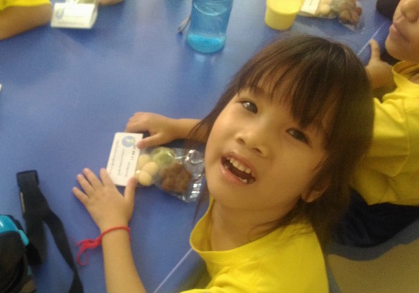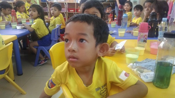 幼稚園の子どもには難しい内容なので、自宅で親御さんに見てもらえる様にクメール語で記載しました。食べる前には、クラスの先生が、豆知識を読み上げ。