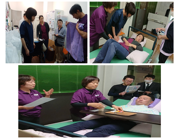 同ステーションの非常勤訪問看護師K様が、「看護の質を上げたい」との想いから支援して下さいました。研修会は、勤務終了後の夕方から廿日市市と広島市の3事業所の職員が集まり講義に続きベッドと車いすのポジショニングに分かれて体験学習をしました。「明日から使える!」「不良姿勢では食べられない」等、多くの感想をいただきました。