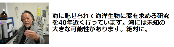 海洋生物を探索源とする本プロジェクトならではの他にはない化合物を見つけることができると期待しています。皆様、応援よろしくお願いいたします