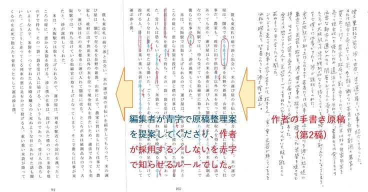 編集者は「青字」で原稿整理案(修正案)を書き込み、作者が「赤字」で原稿整理案の採否を書き込み、編集者に返します。