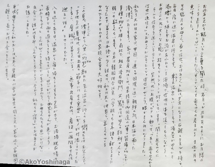 90になり、残る人生で自分に何ができるかを考えました。“みんなの幸せに貢献したい” それが一番の願いでした。“平和な幸せを奪う戦争を、今の人に知ってもらおう。それが平和を守ることに繋がる” そう考えて、戦争に巻き込まれていった1人の子どもと1つの家族、2つの物語を2年かかって書きました。