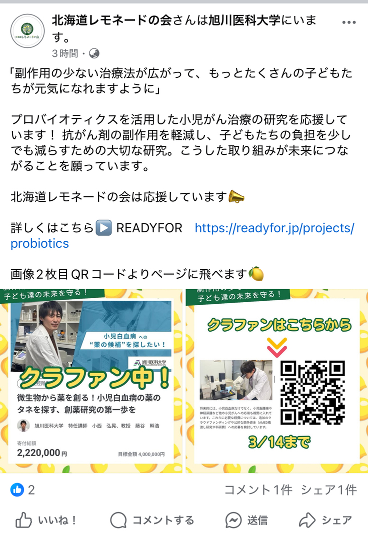 北海道の小児がん患者を支える北海道レモネードの会様にSNSで応援をいただきました!