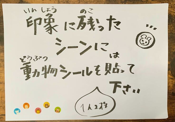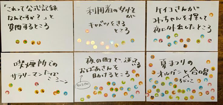 映画「ケアニン」から、6つのシーンをピックアップして、来場者が帰りに「印象に残ったシーンに動物シールを貼る」というアクティビティを行いました。 後半ほど印象に残った人が多い結果になりましたが、「利用者の女性がキャベツを切るシーン」と「ケイコさんがみっちゃんを探して夜に外出したシーン」が、同じくらいの数だったことも要注目です。