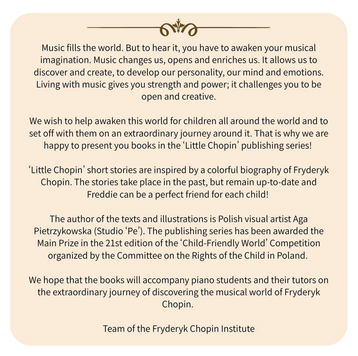 絵本のストーリーはショパンの伝記から着想を得て、ポーランド語、英語、日本語をはじめとする各国語に訳されています。ワルシャワ時代のショパンのエピソードも登場します。