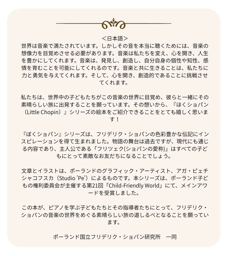 そんな「リトル・ショパン」シリーズを展開するポーランド国立フリデリク・ショパン研究所様より、ピアノを、音楽を楽しむ皆さまへメッセージをお預かりしました😊