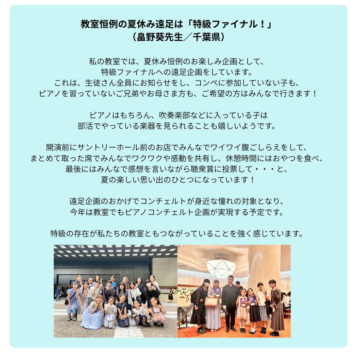 ぜひ、指導者の方々はもちろん、生徒さんや保護者の方々にも、「ピアノをがんばった先」の素敵な姿を目に焼き付けていただき、「ピアノっていいな!」「真剣にやっている人ってカッコいい!」という気持ちを共有する場にしていただけたら嬉しいです。