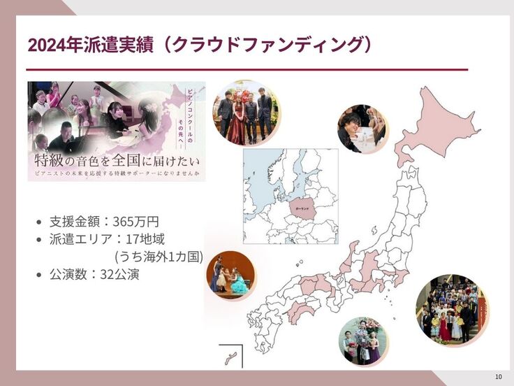 そのような感動を全国各地に直接届けようと、ピティナでは2021年より特級クラウドファンディングに挑戦し、入賞者を全国へ派遣しています。2024年度は247名の方々から365万円のご支援をいただき、全国31公演、海外1か国へとピアニストを派遣することができました。