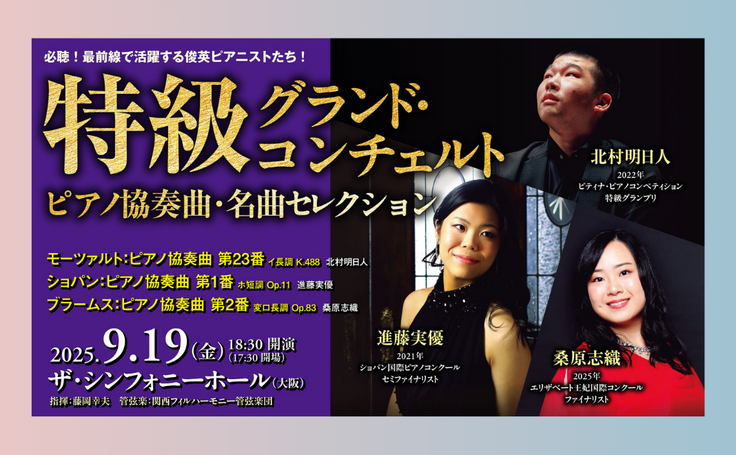 ブリュッセルの初夏、エリザベート王妃国際コンクールで深い感動をもたらした桑原志織のブラームス。前回から4年、いっそうの深みを増してショパンコンクールに帰ってくる進藤実優のショパン。そして、ソロ・アンサンブル・指導で日本全国から連日引っ張りだこの北村明日人のモーツァルト。共演は「グランド・コンチェルト」の数々の名演を創り上げてきた藤岡幸夫と関西フィル。2025年秋、まさに今、絶対に聞いておきたい3人のコンチェルトが、ザ・シンフォニーホールに響きわたります。乞うご期待!