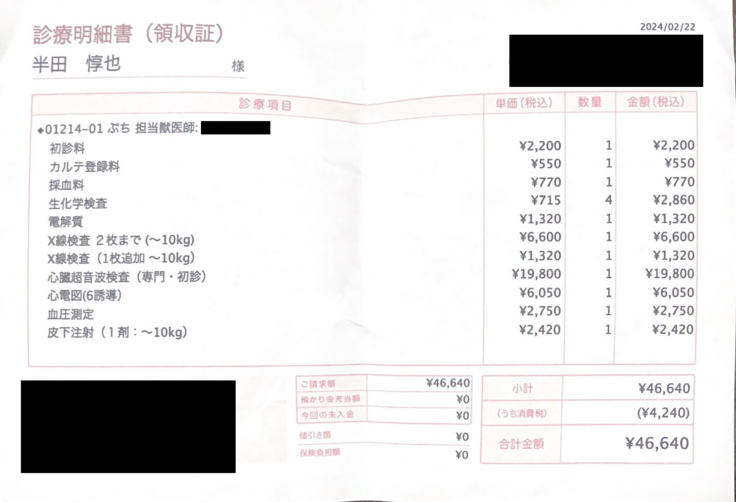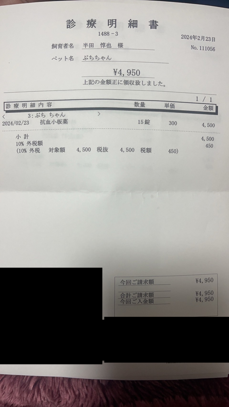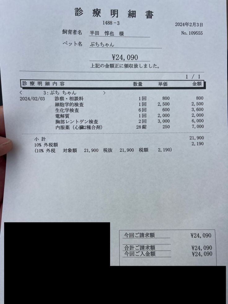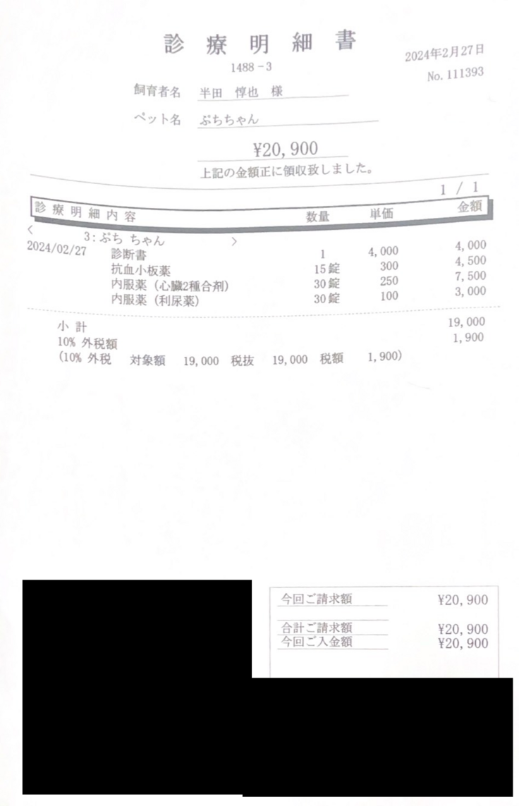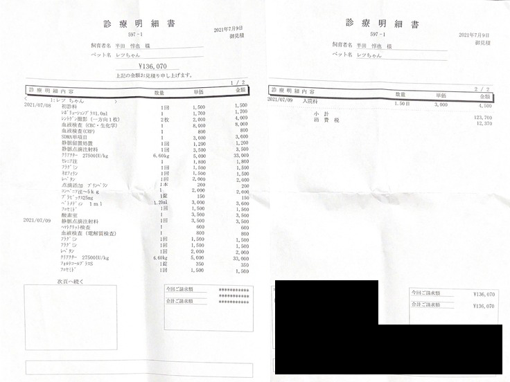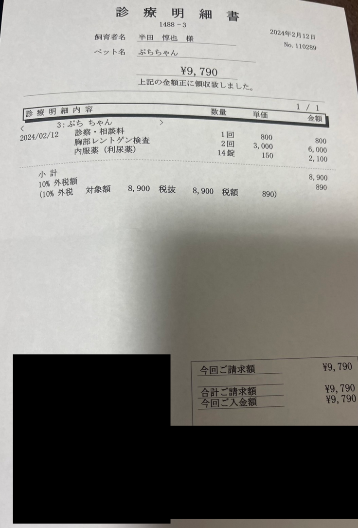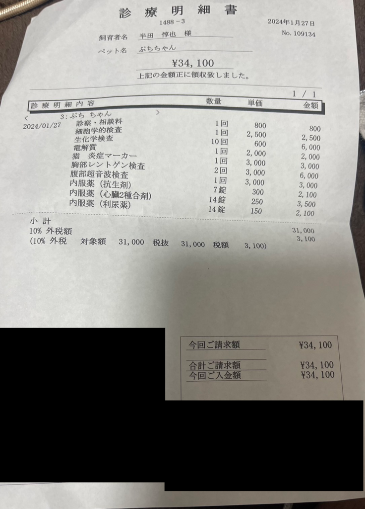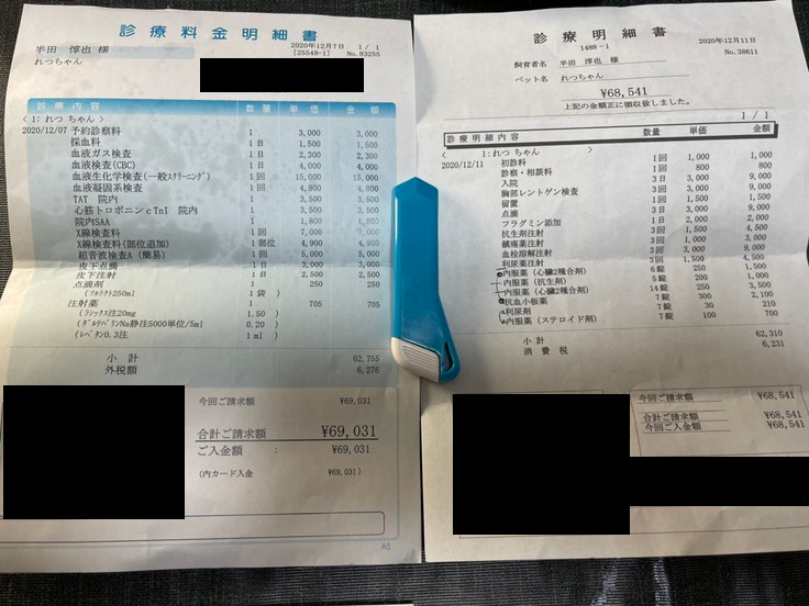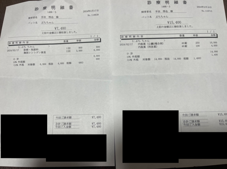 以降先住猫のれつの治療の際にかかった入院費などの一部だけではありますが、これからぷちにもかかってくるであろう費用の参考として載せておきます。