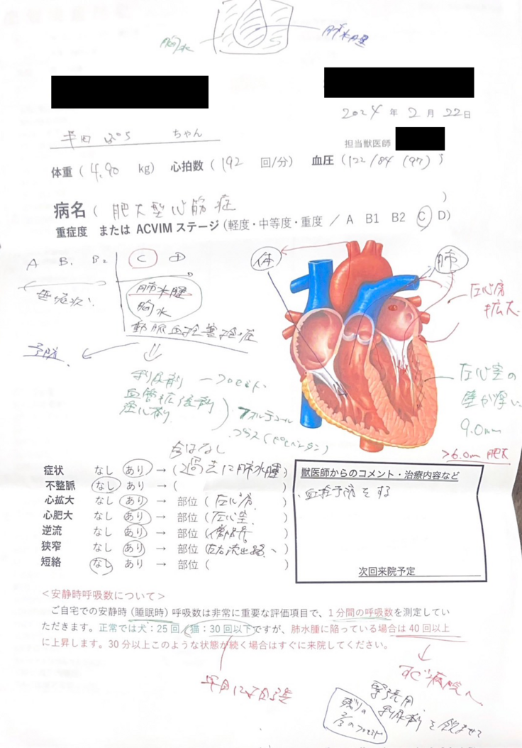 すぐにかかりつけの病院へ行き、検査をしてもらったところ肺水腫と心左房が厚くなっていると言われました。薬を飲ませ続けていましたが、この4日後にまた肺水腫を起こし、3日後に病院の判断で一旦利尿剤を試しに切ったところ、その7日後にまた肺水腫を起こしました。