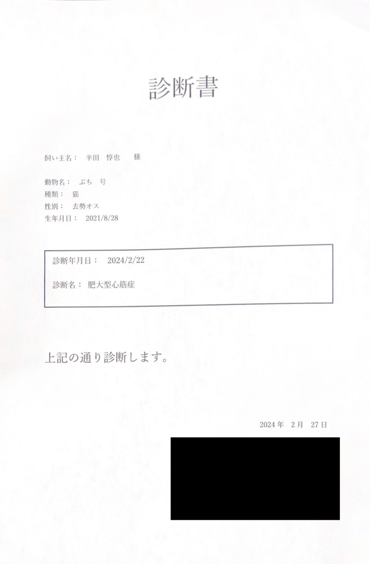 2月27日、肥大型心筋症との診断書を作成していただき、合わせて追加のお薬を処方していただきました。