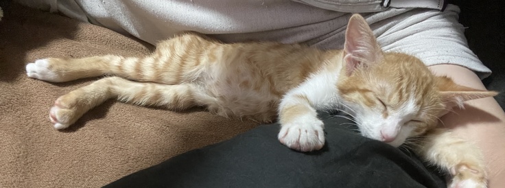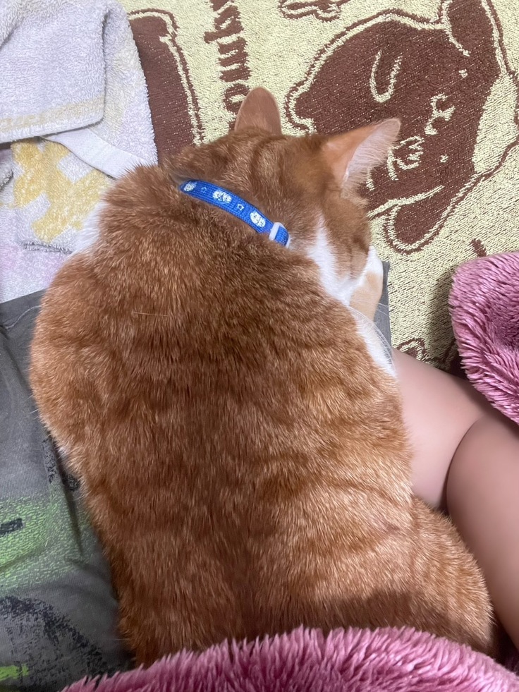 ぷちとの出会いは、先住猫のれつが心臓病の闘病生活の末に亡くなって数か月が経った頃にれつと出会った、あるNPO法人のアニマルシェルターに寄付をしようと訪れたところで「また里親募集中の猫ちゃんを見ていきませんか?」という流れから拝見して、れつと同じ茶虎柄の猫である当時子猫だったぷちに出会い、ぷちのあまりの可愛さと人懐っこさに惹かれて里親になることとなりました。毎晩枕元に来て一緒に寝たがるほど本当に甘えん坊な子です。