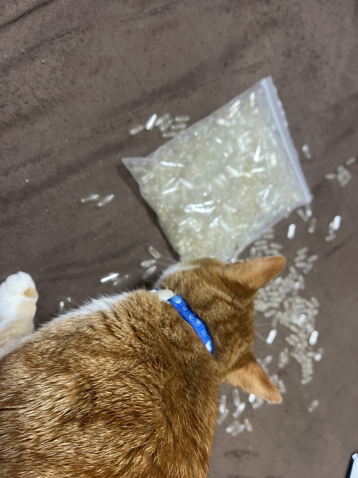 たくさん入ったカプセルをこの間購入して高いところに上げておいたのですが、今日仕事から帰ってみるとぷちが高いところに登ってカプセル袋を落としてイタズラをしていました。