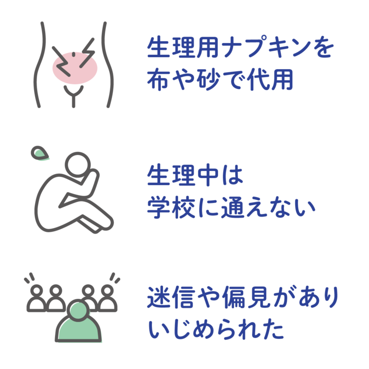 たとえばネパールでは、生理中の女性を隔離する風習があり、家のキッチンに立つことや、ベッドで寝ることが許されないこともあります。納屋に隔離された女性が、蛇や野生動物に襲われて命を落とすことも少なくなく、近年では社会問題となっています。