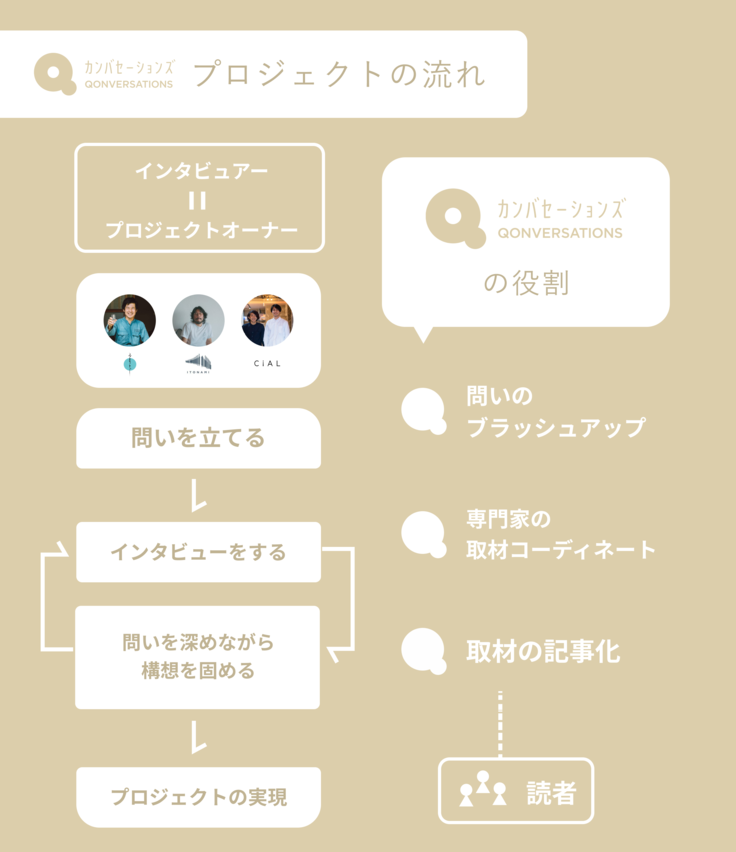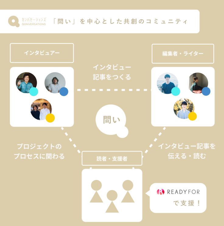 そんな思いを持つカンバセーションズでは今後、「問い」をカタチにする実行者(インタビュアー)、彼らの取り組みを最も近い場所からサポートし、ストーリーを伝えてくれる伴走者(編集者・ライター)、 そして、問いをカタチにしていくプロセスを応援し、時にそのプロセスに参加・協力してくれる応援者(メディア読者、クラウドファンディング支援者、スポンサー)という3者の関係性を築いていくことを目指しています。