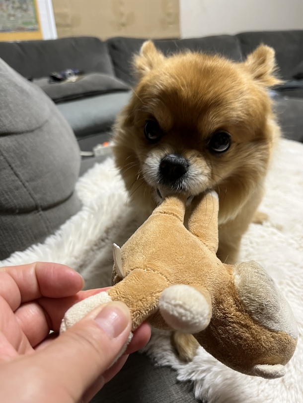 くーちゃんとお猿のジョージを引っ張りあって、くーは離しません。