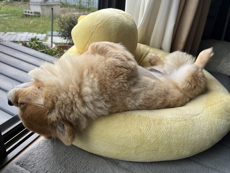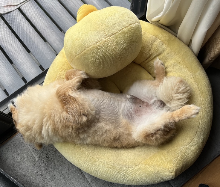 ぴーちゃんベッドからはみ出てる😅