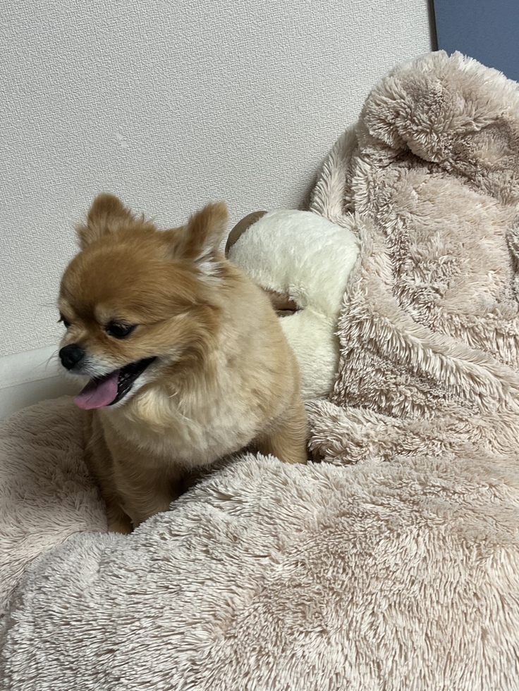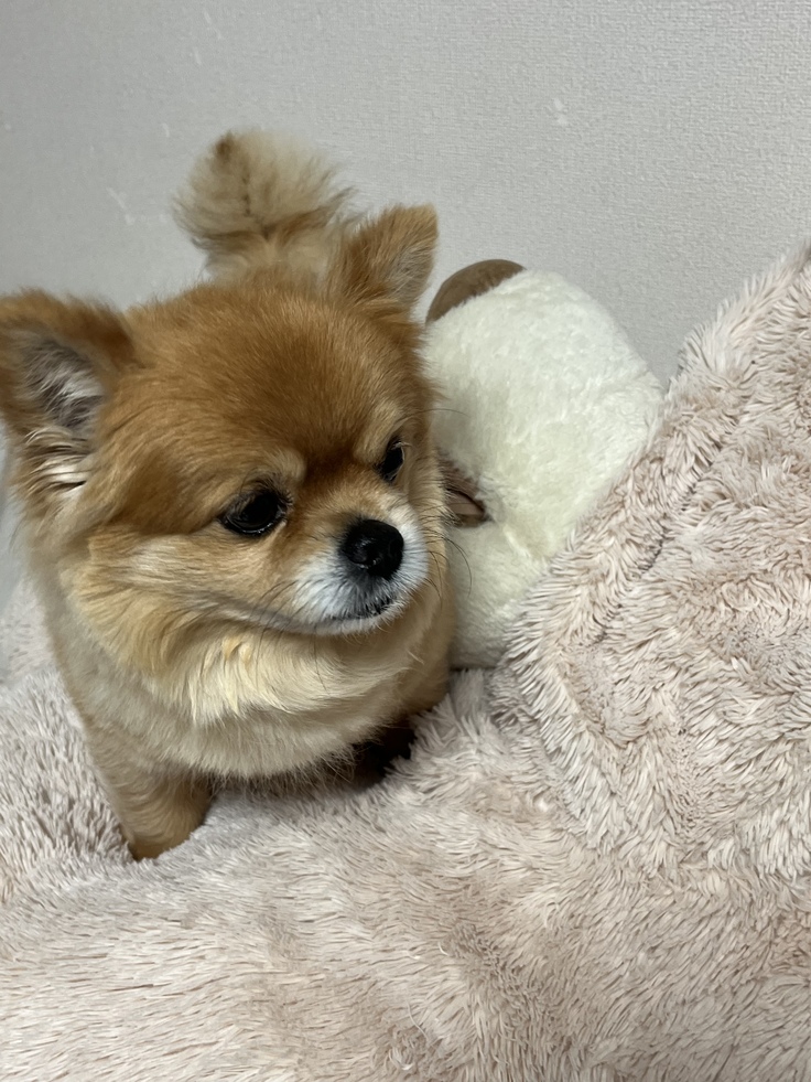 くーちゃん、おっきいクマさん🧸を踏みつけ、オモチャを探し中!