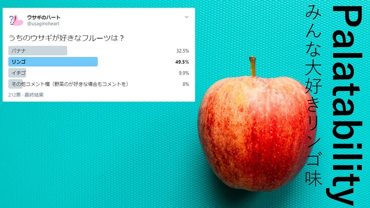 また、栄養バランス・機能性だけではなく、味も大切です。ウサギに「美味しい」と感じてもらえるよう、嗜好性も考慮し、皆が大好きなリンゴを配合しました。