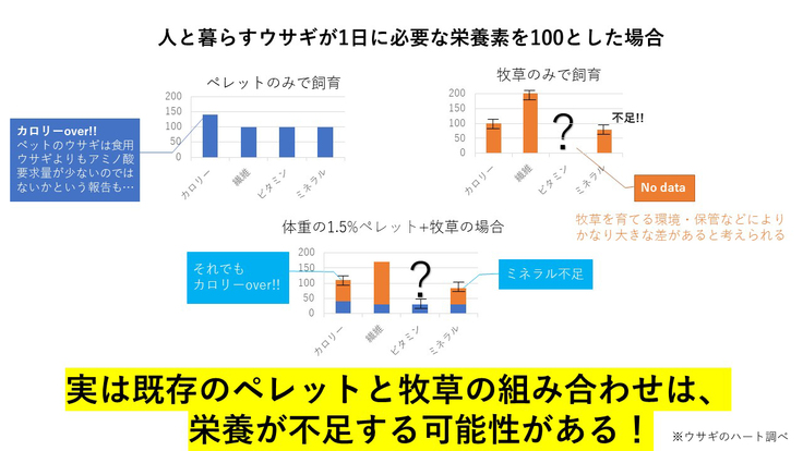 ラビットフードに関しては、確立された栄養基準が少なく、まだまだエビデンスが乏しいのが実情です。