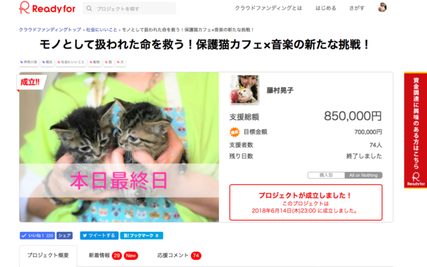 サポーター募集中/保護猫カフェ閉店で残った猫の飼育への援助を!